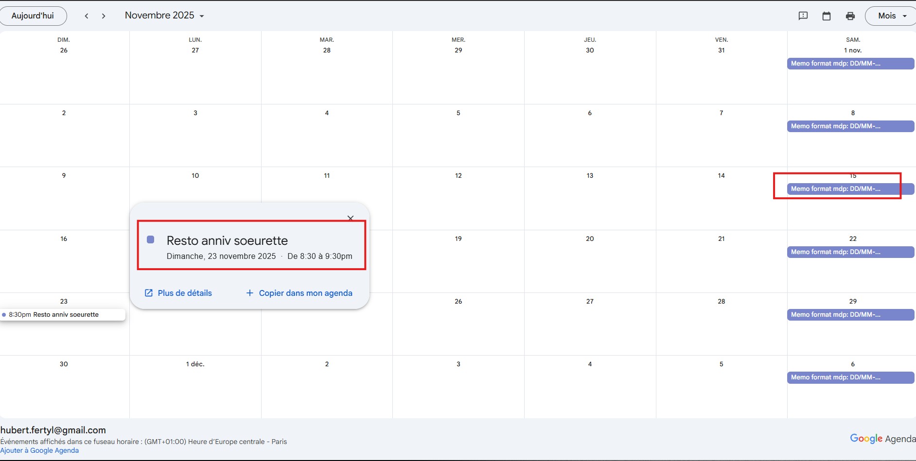 Anniversaire de la sœur : 23/11 Un autre événement précise le format : DD/MM-...