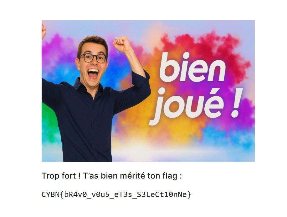- Flag : CYBN{bR4v0_v0u5_eT3s_S3LeCt10nNe}