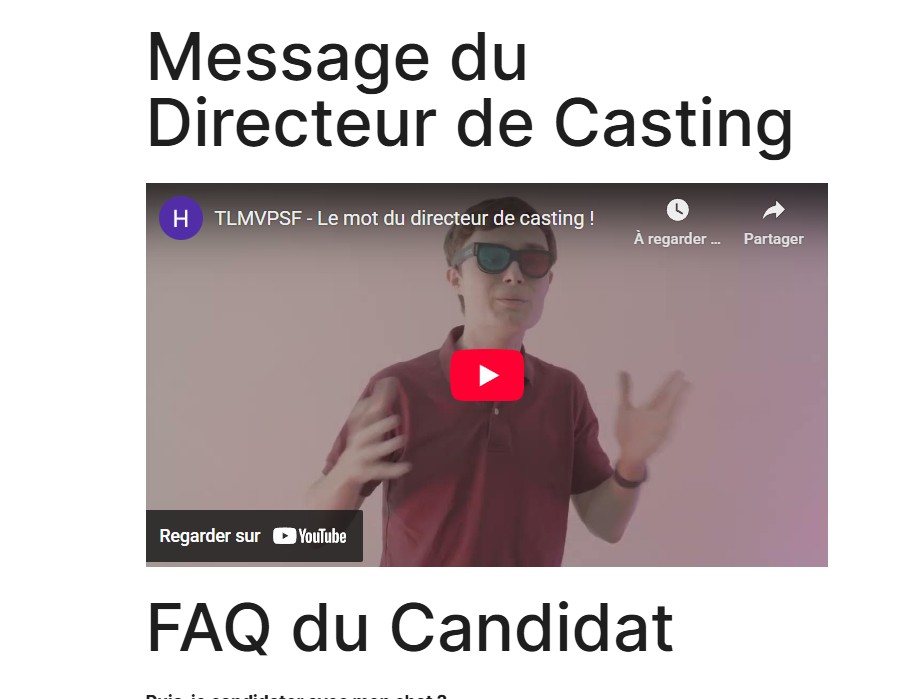 Je suis dégoûté ! Ça fait super longtemps que j’ai tenté ma chance en m’inscrivant au casting de cette nouvelle émission, et la prod n’a même pas été fichue de me recontacter. Puisqu’on me répète que “tout ce qu’il faut savoir est déjà public”, je vais essayer de mieux regarder leur site pour comprendre où en est la sélection : https://tlmvpsf.wordpress.com/.