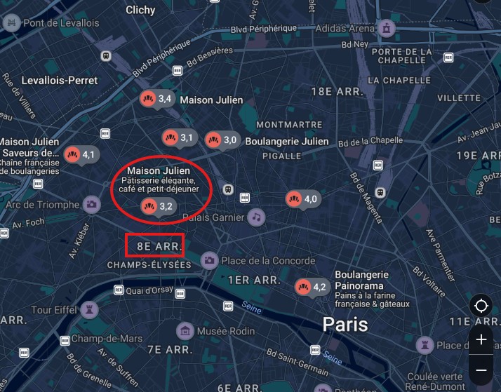 J’ai pensé d’abord à un restaurant, j’ai donc tapé julien restaurant Paris, mais aucun dans le 8ème arrondissement. J’ai donc pensé à une devanture de boulangerie, j’ai donc tapé julien boulangerie Paris beaucoup plus de résultat dans le 8ème arrondissement.