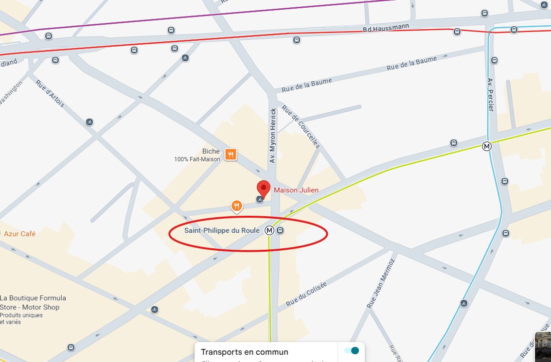 La plus proche à pied : Saint-Philippe-du-Roule avec la vue des transports sur google map.