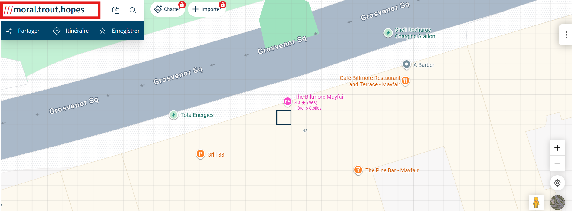 Le What3words nous renvoie vers le The Biltmore Mayfair Hotel.