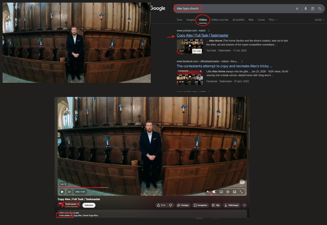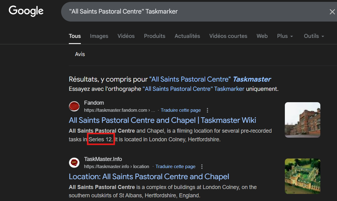 On confirme avec le nom de la série et un dork. "All Saints Pastoral Centre" Taskmaster