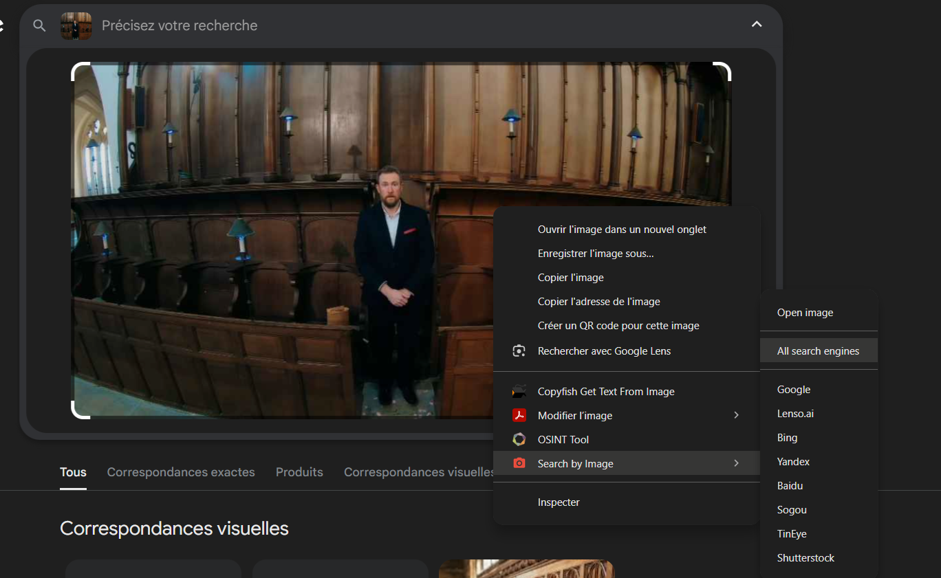 - On va utiliser une recherche faciale inversée. J’utilise l’outil Search by Image. Il permet de rechercher l’image en un clic sur plusieurs moteurs de recherche.