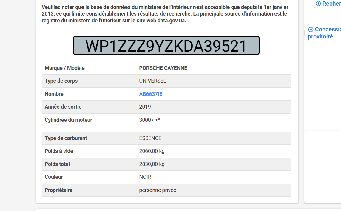 OSINT{AB6637IE, PORSCHE, CAYENNE, 2019, 36921KM}